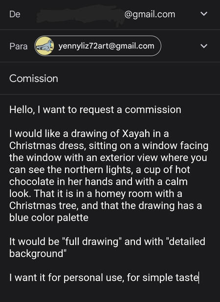 If you are interested in my commissions send me a message to my email ([email protected]) or to my social networks for direct contact a message with the following